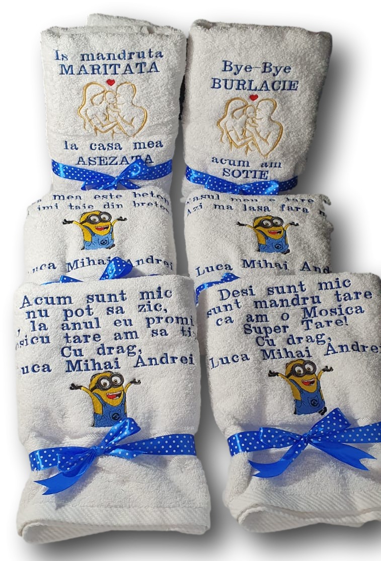 Nasii Dvs. merita cu siguranta un cadou cu adevarat special, nu doar util, dar si original si deosebit. Un set de prosoape din bumbac 100%, calitate premium, cu capacitate foarte mare de absorbtie, personalizate prin broderie, cea mai calitativa si eleganta modalitate de personalizare.