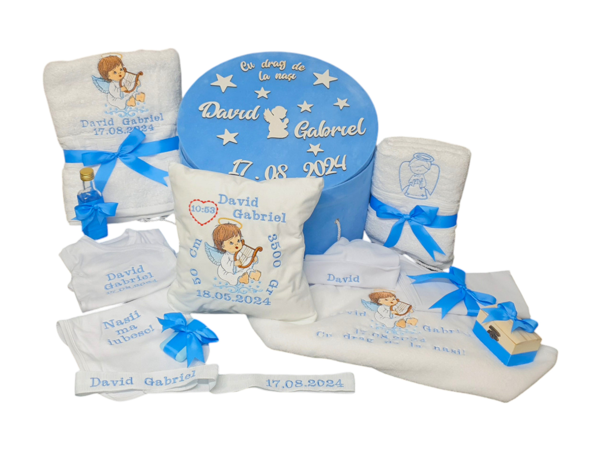 -Perna brodată cu datele lu bebe (nume, data nașteri , cm, kg , ora nasterii , și personajul alesese tine)